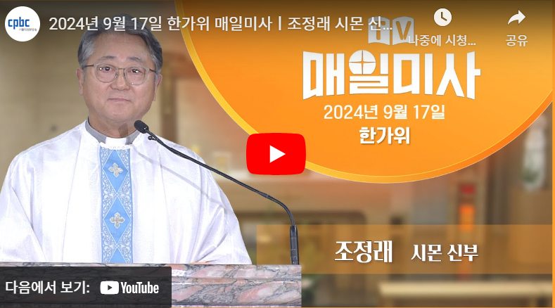 오늘은 우리 민족의 큰 명절 한가위입니다. 계절의 변화를 섭리하시고 수확의 기쁨을 주시는 하느님 아버지께 감사드리며, 이웃과 서로 나누며 살아온 조상들의 아름다운 마음을 본받읍시다. 자신을 위해서만 재화를 모으는 어리석은 부자가 되지 않도록 우리도 나눔을 실천하기로 다짐하며 주님의 잔치에 참여합시다.