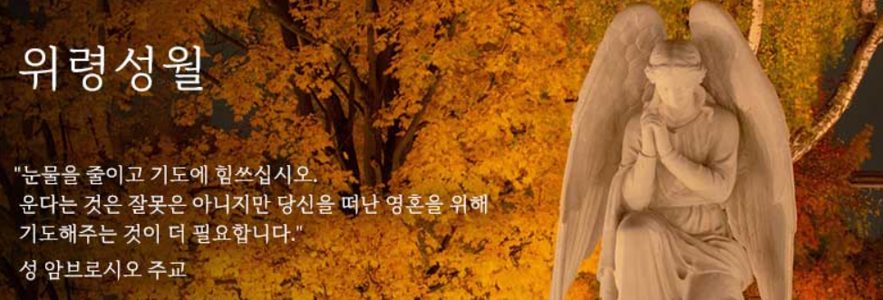 가톨릭 교회가 세상을 떠난 이들의 영혼을 기억하며 기도하는 달입니다. 한국 교회는 위령의 날(11월 2일)과 연관시켜 11월을 위령성월로 정해 놓았고, 이달에 신자들은 이미 세상을 떠난 부모나 친지(親知)의 영혼, 특히 아무도 기도해 주지 않은 연옥(煉獄)영혼들을 위해서도 기도와 희생을 바치도록 하고 있습니다.
