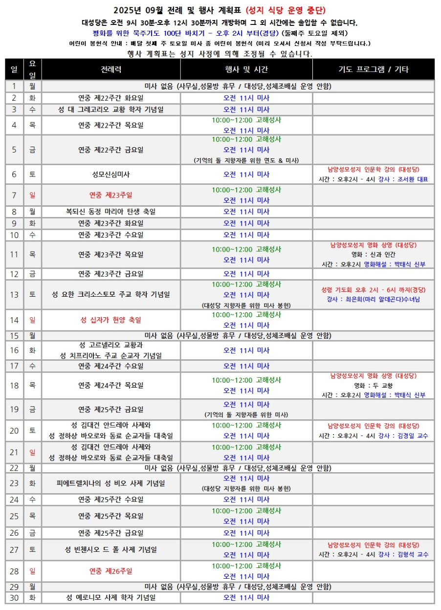 | 평일미사 (화/수/목/금) | 11:00 (목: 고해성사 10:00 -15:30) | 대성당 |