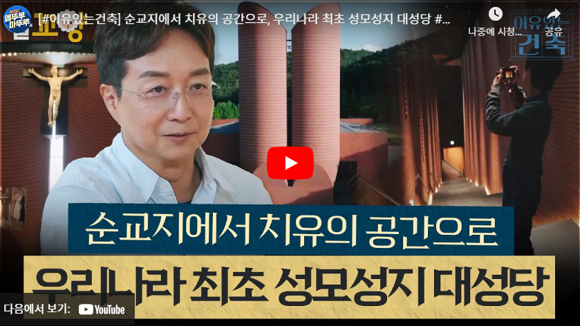 마리오 보타, 줄리아노 반지, 페터 춤토어, 승효상, 이동준, 한만원, 정영선 선생님, 이상각 신부님의 인터뷰가 담긴 남양성모성지의 건축과 예술에 대한 이야기 입니다. 남양성지에서 전해지는 소식지를 통해서 대성당이 지어지기 까지의 기적같은 이야기들을 듣고 있었는데 영상과 함께 세계적으로 저명한 분들의 생생한 목소리와 함께 완성된 대성당을 함께 보니 감격적이네요 ㅠ