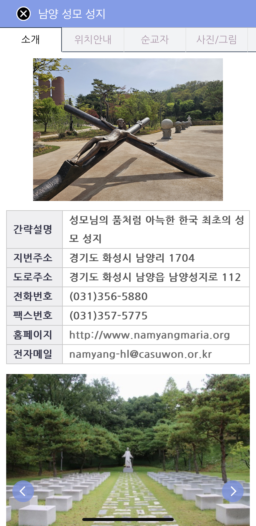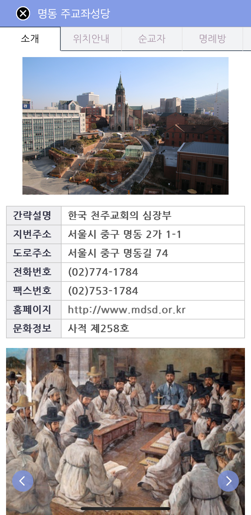 - 성지와 사적지 : 한국 천주교의 성지와 사적지에 관련된 정보, 사진 등을 조회할수 있습니다