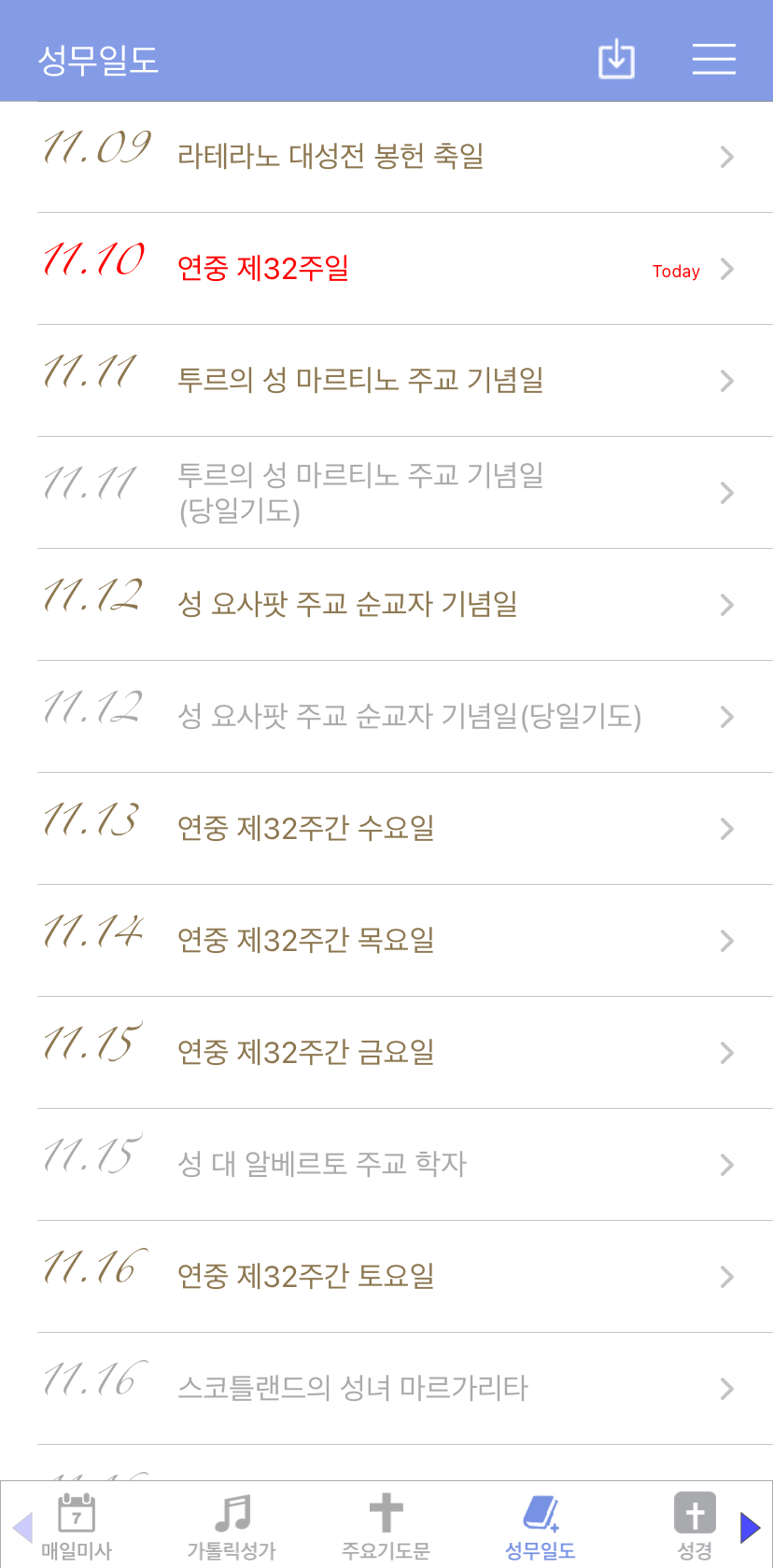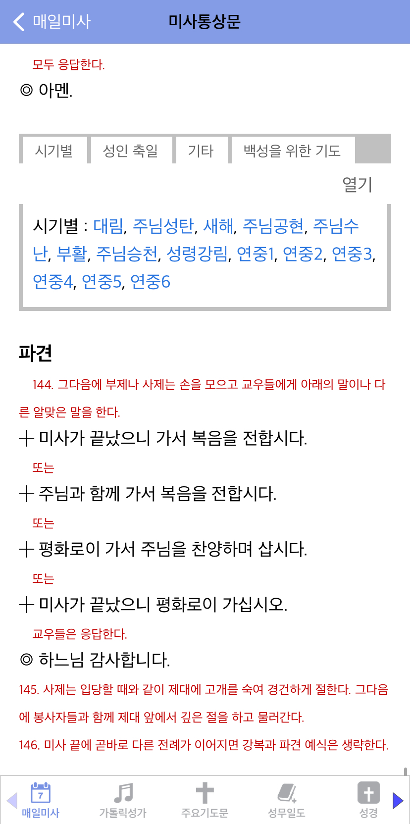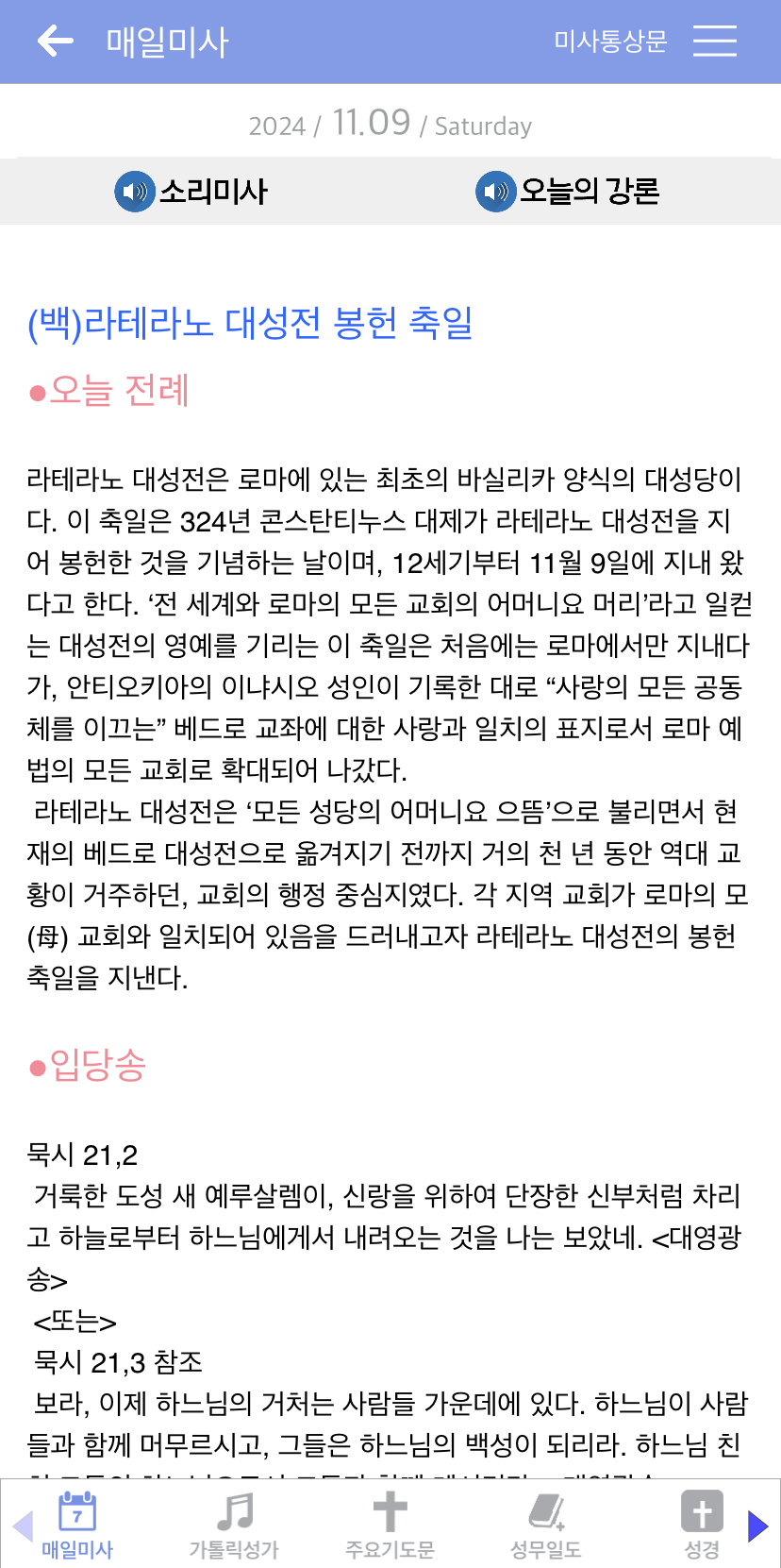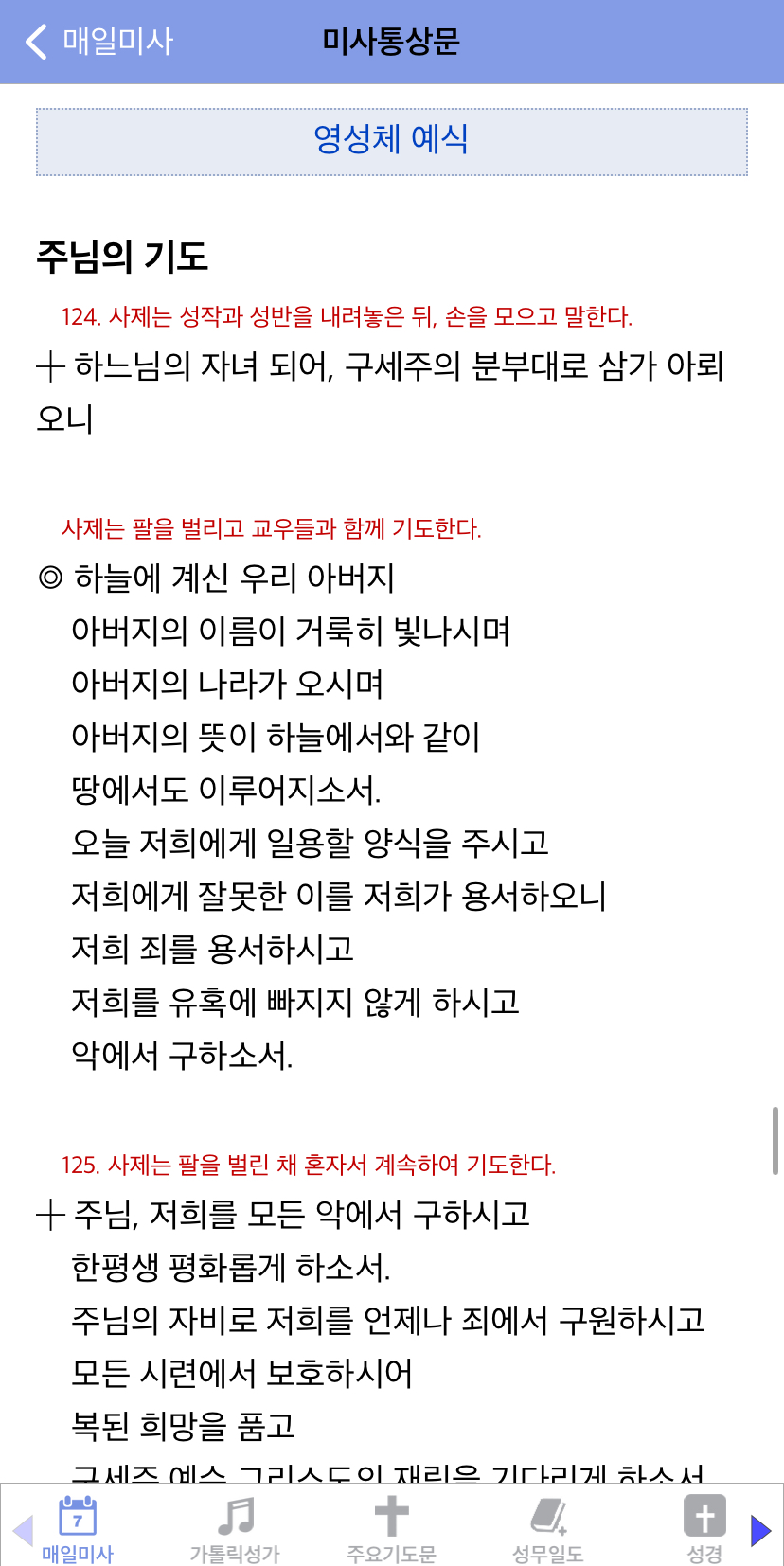 - 성무일도: 매일매일의 성무일도와 볼 수 있으며 주요 기도는 소리를 통해 들을 수 있습니다.