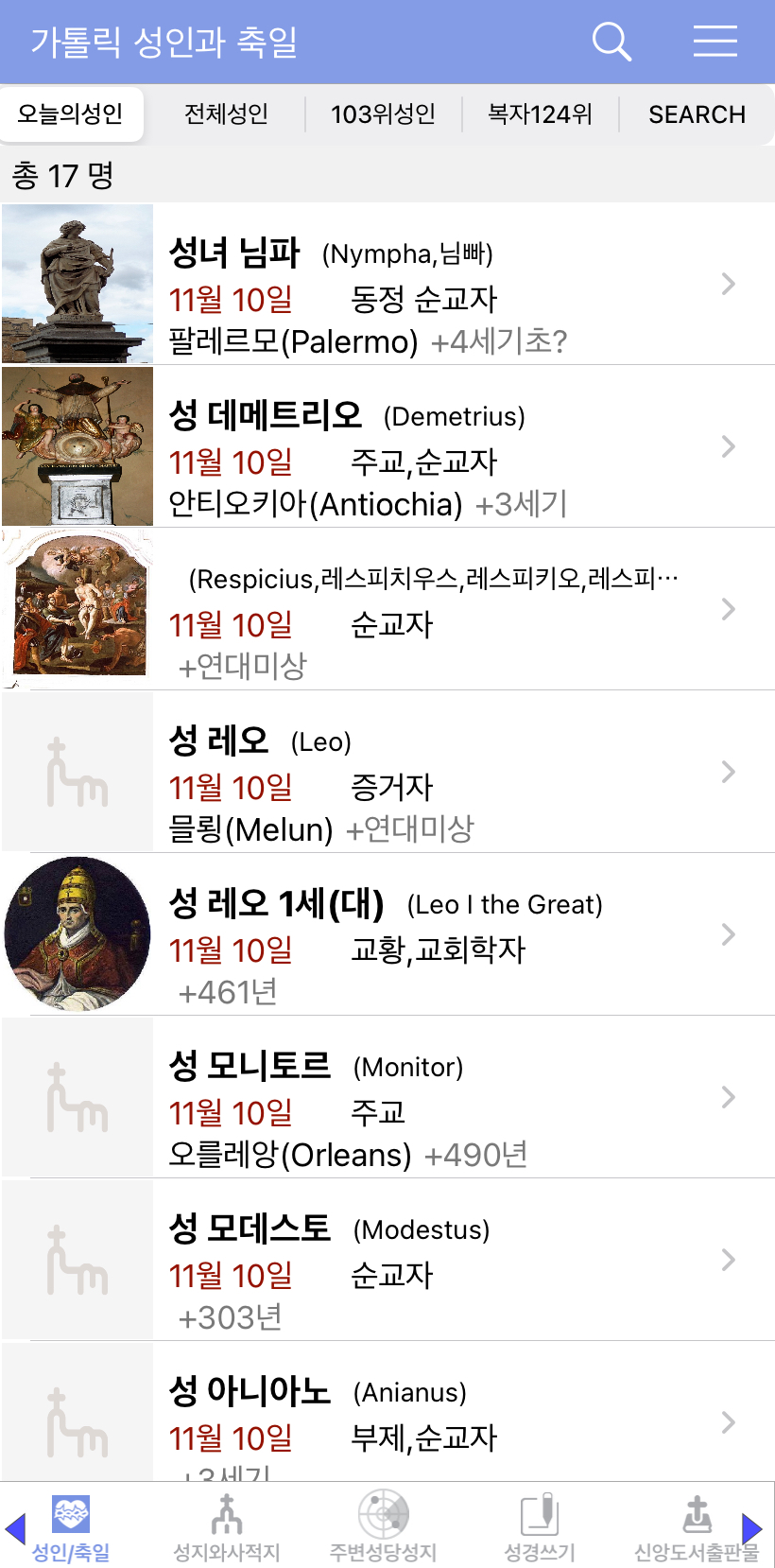 6521분에 해당하는 가톨릭 성인 목록과 오늘의 성인, 특히 한국 성인인 103위 성인과 복자 124분의 명단과 각 성인의 활동지역과 연도를 포함한 상세 설명을 확인하실 수 있습니다. 특히 오늘의 성인을 보면서 축일을 맞는 지인분들을께 놓치지 않고 축하 인사를 전하기도 좋습니다.
