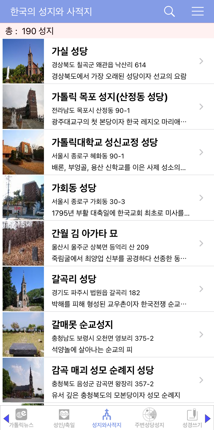 가톨릭 성지 목록을 통해 190곳의 위치정보와 함께 상세 설명을 확인하실 수 있습니다