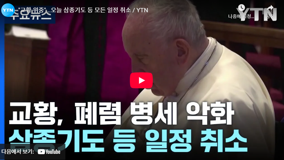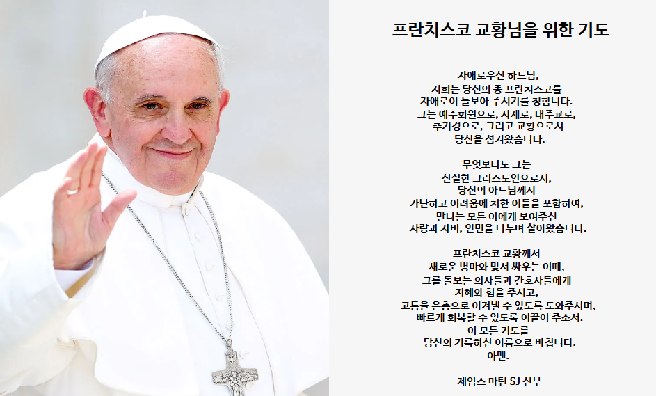2025년 2월 14일부터 폐렴으로 입원하신 교황님의 병세가 점점 악화되어 2월 23일 고압 산소 치료를 받을 만큼 위중하시다는 뉴스가 나오네요 ㅠ 교황님을 위한 기도문을 찾다가 평소 드리던 교황이나 주교를 위한 기도가 아니라 투병중이신 교황님을 위한 기도문을 찾아 공유해 봅니다. 전 세계 많은 이들의 정성스런 기도가 모여 빠른 쾌유의 은총이 교황님께 허락되기를 빌어봅니다.