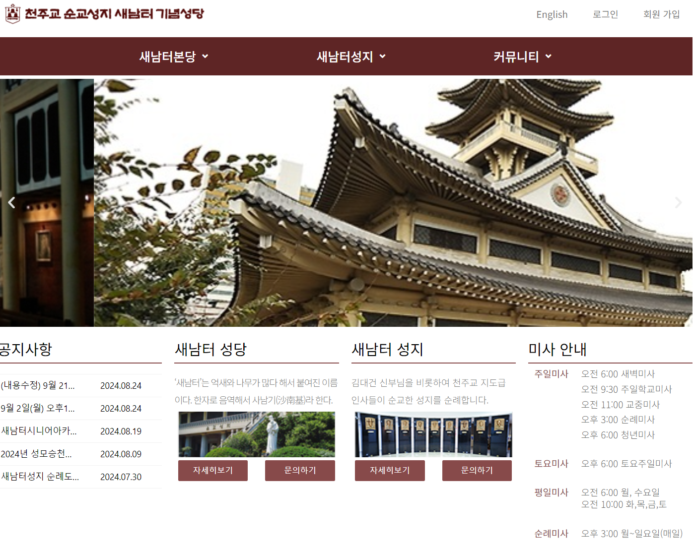 | 주일미사 | 오전 6:00 새벽미사 오전 9:30 주일학교미사 오전 11:00 교중미사 오후 3:00 순례미사 오후 6:00 청년미사 |