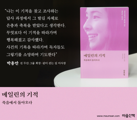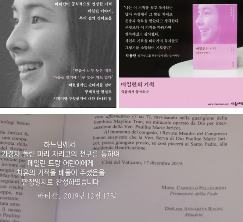 책은 메일린의 아버지 에마뉘엘 트란이 딸의 치유 과정을 일기처럼 기록한 생생한 증언입니다. 그는 기적을 과장하지 않고 차분히 사실을 전달하여 독자로 하여금 기적의 현존을 신뢰하게 합니다. 이 이야기는 박용만 전 두산 그룹 회장의 노력으로 국내에 소개되었습니다. 박 전 회장은 우연히 메일린의 이야기를 접하고 프랑스에서 가족을 만나고 로마에서 바티칸의 승인 과정을 확인했습니다. 이 여정은 CPBC 가톨릭평화방송의 다큐멘터리 〈죽음에서 돌아오다-메일린의 기적〉으로도 제작되었습니다. 메일린의 기적은 신앙과 기도의 힘을 보여주는 감동적인 증거입니다.