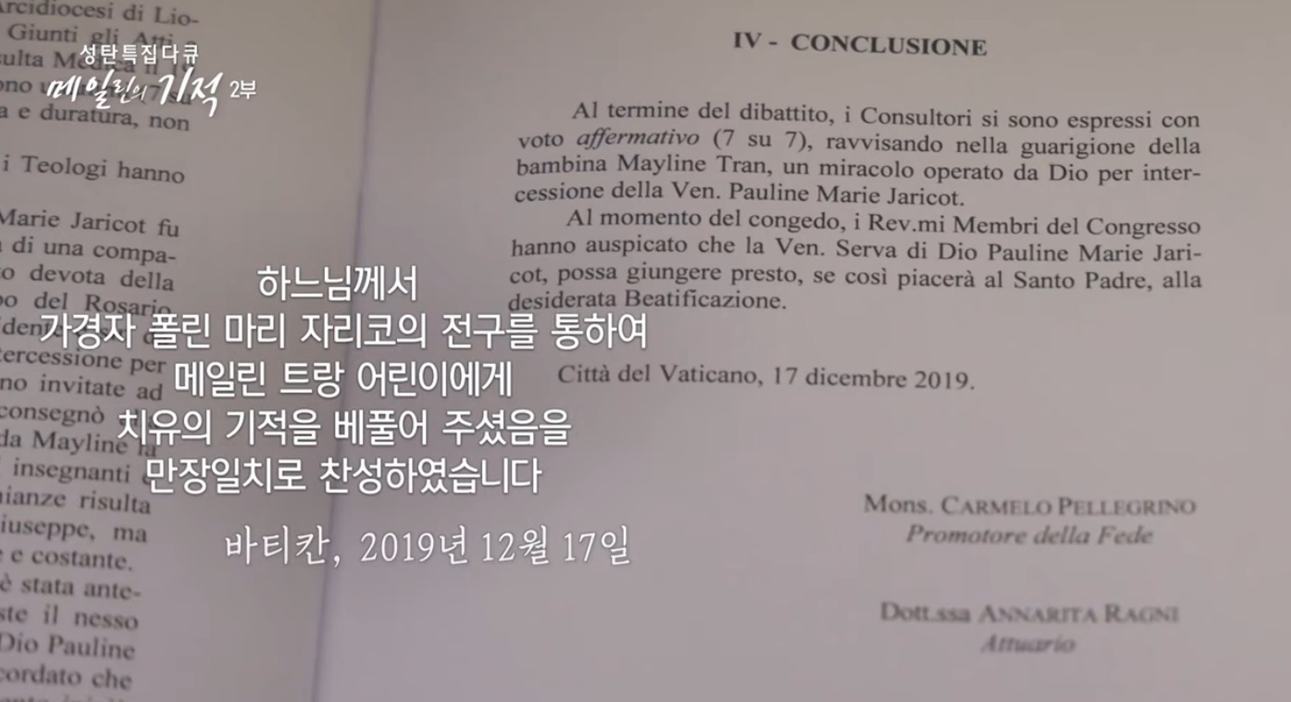 메일린의 회복은 단순한 우연이 아니었습니다. 사고 소식을 들은 리옹의 카톨릭 학교에서는 9일 기도가 시작되었습니다. 이 기도는 폴린 자리코 복녀, 19세기 교황청 전교회를 설립한 가경자의 전구를 청하는 것이었습니다. 폴린 자리코는 부유한 방직 공장 집안에서 태어났지만, 하층민으로 일하며 번 돈을 세계 선교지에 기부한 인물로, 한국 천주교 역사에도 기여한 바 있습니다.